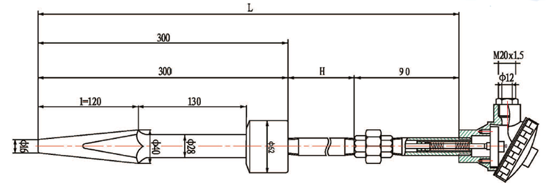 烟道、风道热电偶主要用于电站排烟温度测量。它的特点是采用较粗的保护管和大直径联接螺纹,以提高抗烟气冲刷和排烟机震动的能力,其测量端采用缩径式,以减小热响应时间。